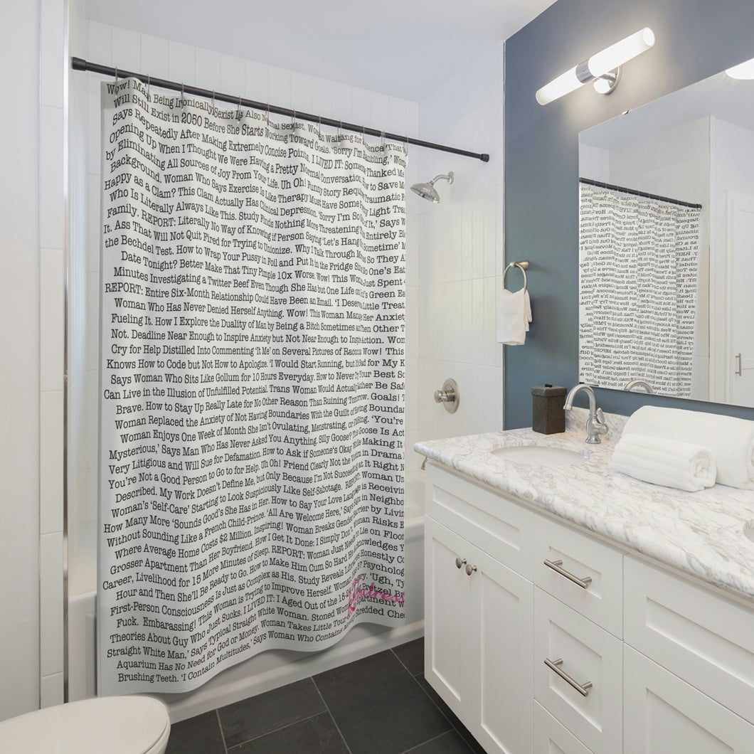 Looking to zhuzh up your shower? Need new reading material for the bathroom? Wish you could just have a little more Reductress in your life? With the best of Reductress's headlines, this shower curtain does it all and will punch up any bathroom style.
