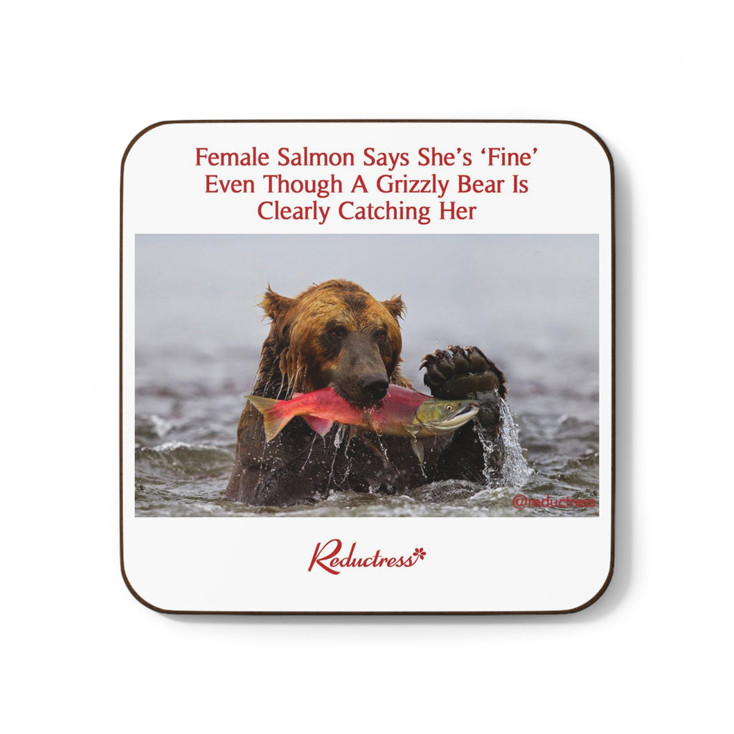 "Female Salmon Says She's 'Fine' Even Though A Grizzly Bear Is Clearly Catching Her" Hardboard Back Coaster