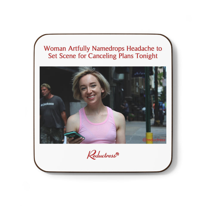 "Woman Artfully Namedrops Headache to Set Scene for Canceling Plans Tonight" Hardboard Back Coaster