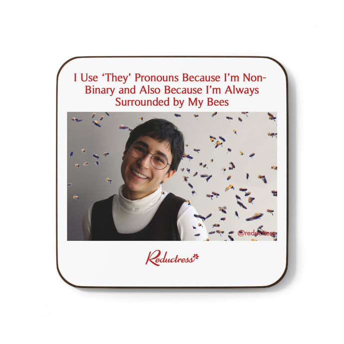 "I Use ‘They’ Pronouns Because I’m Non-Binary and Also Because I’m Always Surrounded by My Bees" Hardboard Back Coaster