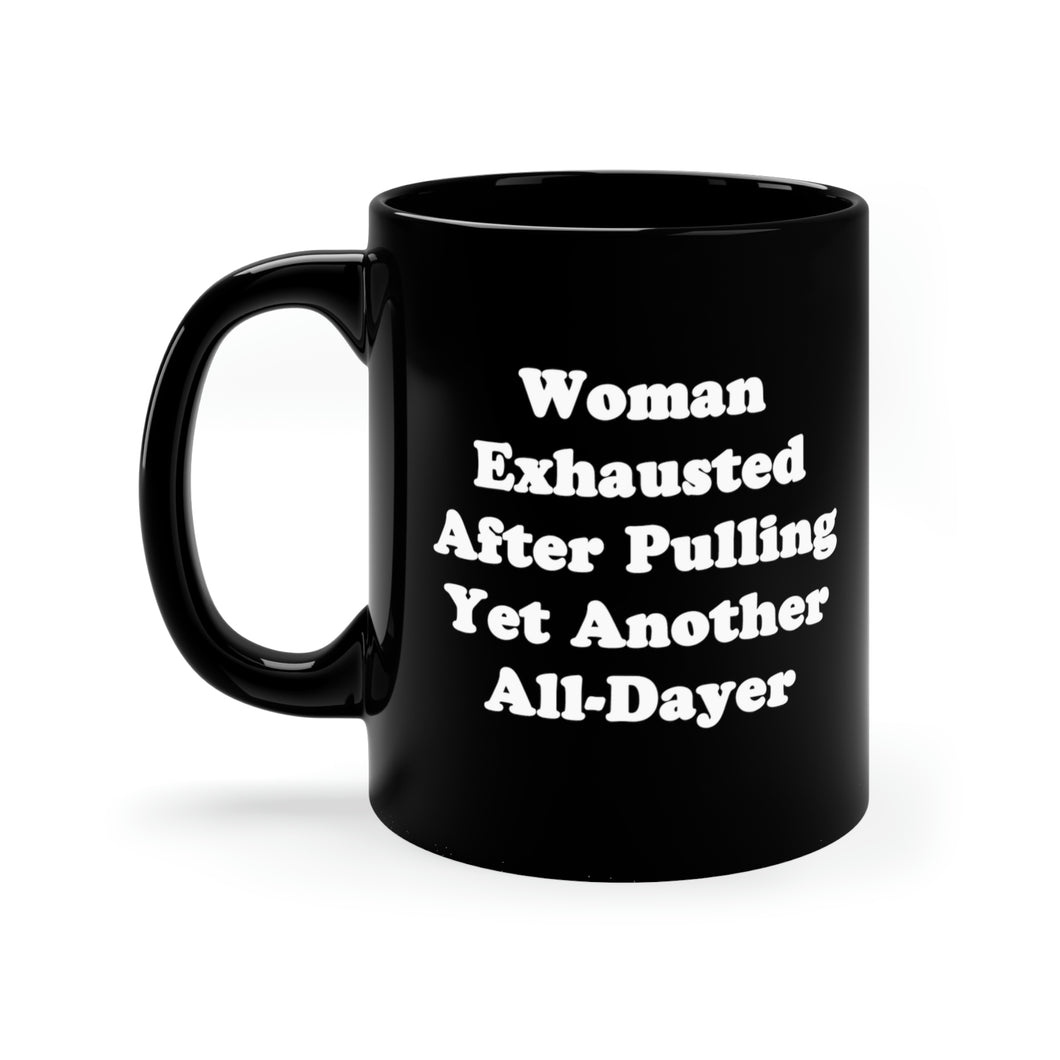 "Woman Exhausted After Pulling Yet Another All-Dayer" Black Mug